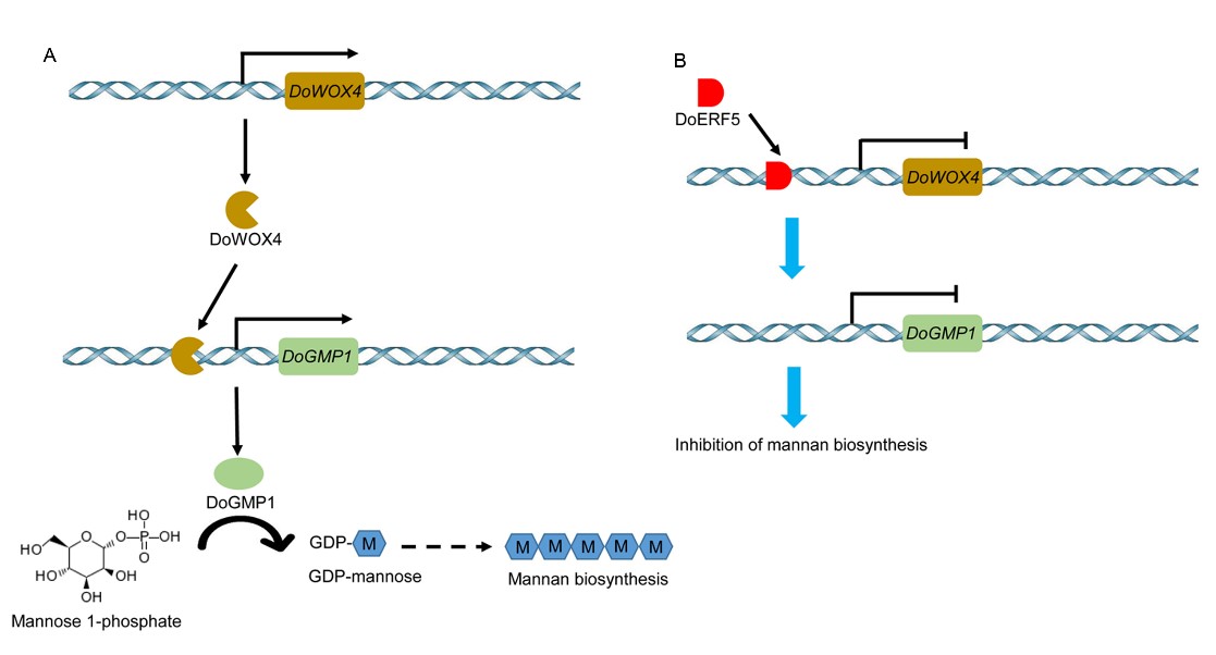 ERF5-WOX4调控铁皮石斛甘露聚糖生物合成的工作模型 已毕业的中国科学院华南植物园博士、现福建农林大学青年教师曾丹琦为论文第一作者,...